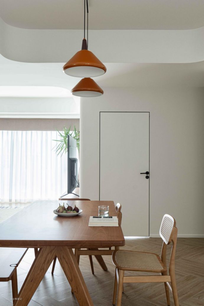 ⭕客餐厅打通设计,两个区域顶面天花的吊顶造型均采用弧形元素,不仅可以拔高层高,也是本户的“凹造型”神器✨休闲区弧形吊顶➕无主灯➕落地窗组合,空间显大不止一点点🤏;餐厅区还特意搭配上线性灯,营造了舒适的用餐氛围~