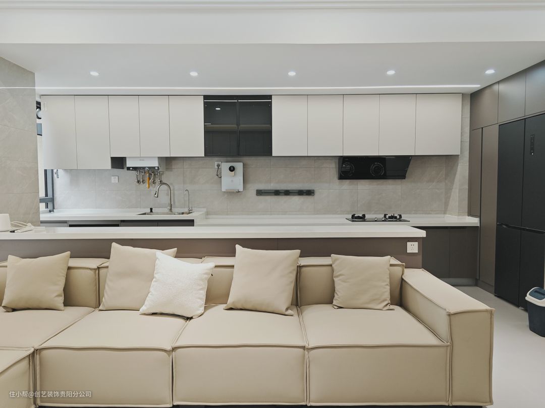 ✨ 厨房和客厅仅一墙之隔,如果按原户型布局只能做L型橱柜,厨房台面不够,采光也差,所以毫不犹豫打掉了隔墙,厨房空间瞬间变大了一倍都不止。