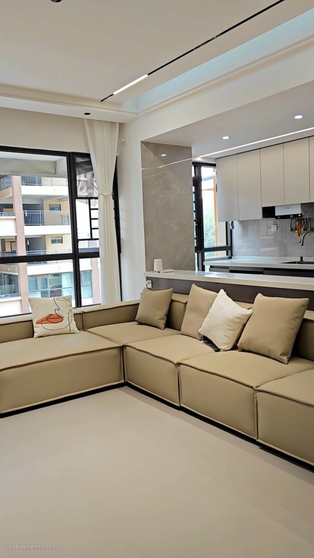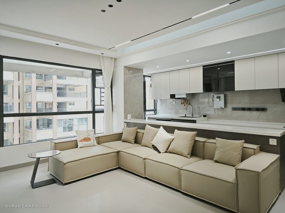 ✨ 通铺仿微水泥柔光砖、拆掉阳台推拉门,封上落地窗、悬浮吊顶+无主灯设计,让空间更大视野更开阔。