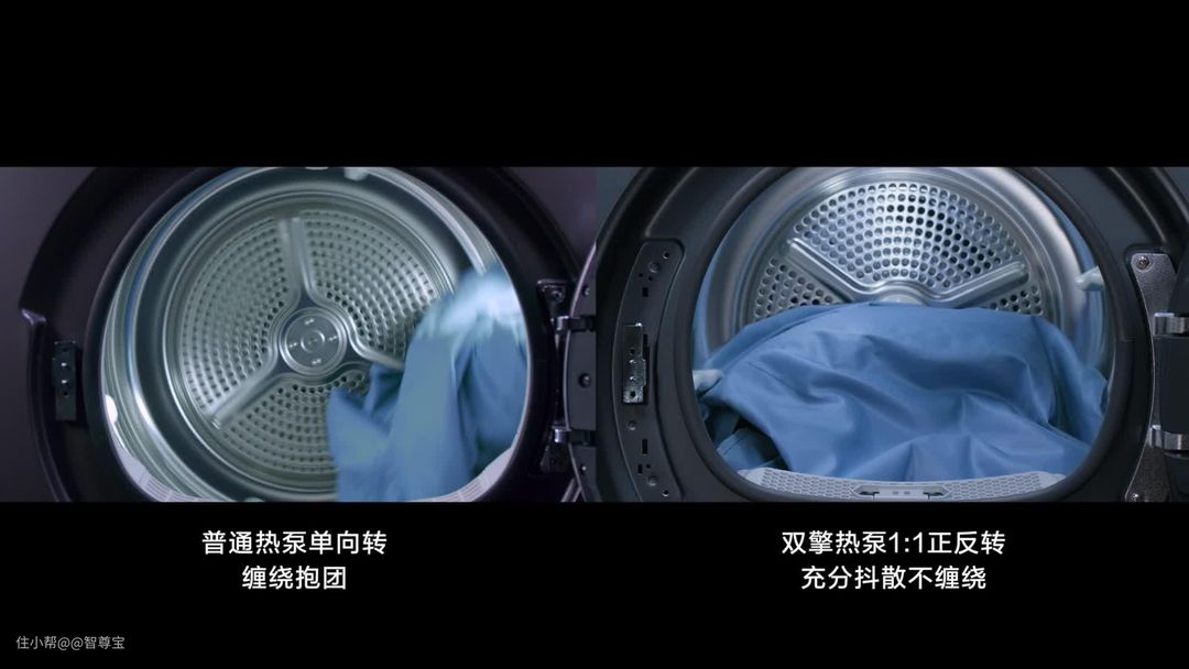 2、最新烘干技术之【双擎热泵】—1:1正反转,大件衣物烘干舒展透干!