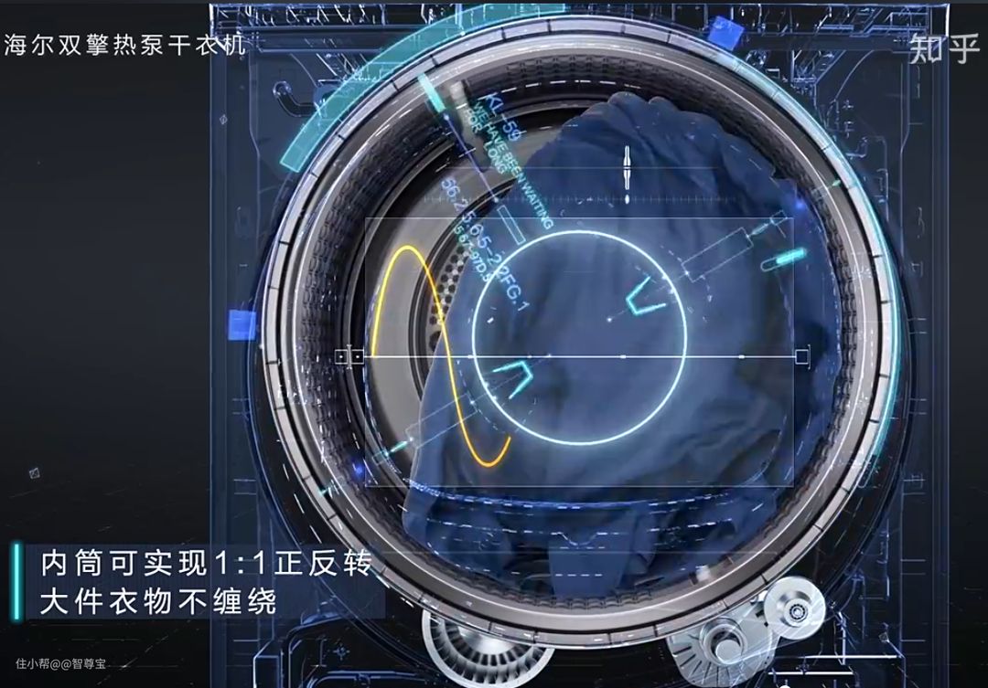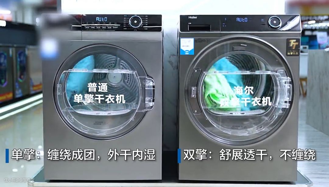 在烘干机方面,为了解决衣物缠绕的问题,海尔推出了带有1:1正反转功能的烘干机(目前,其他品牌暂时没有双擎热泵技术)。为了解决大件夹层不过烘问题,海尔推出了3D透视技术,一次烘好,不伤衣物。