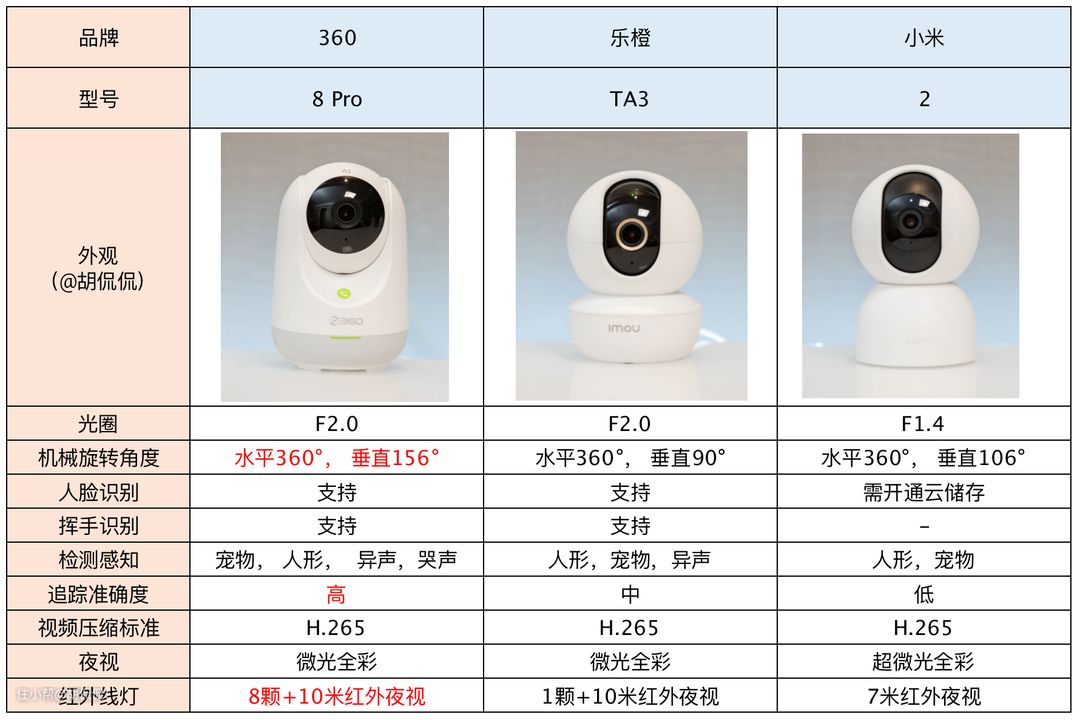 三款均是400万像素以上的高清摄像机, 其中360是唯一一款采用了500万像素的摄像机。