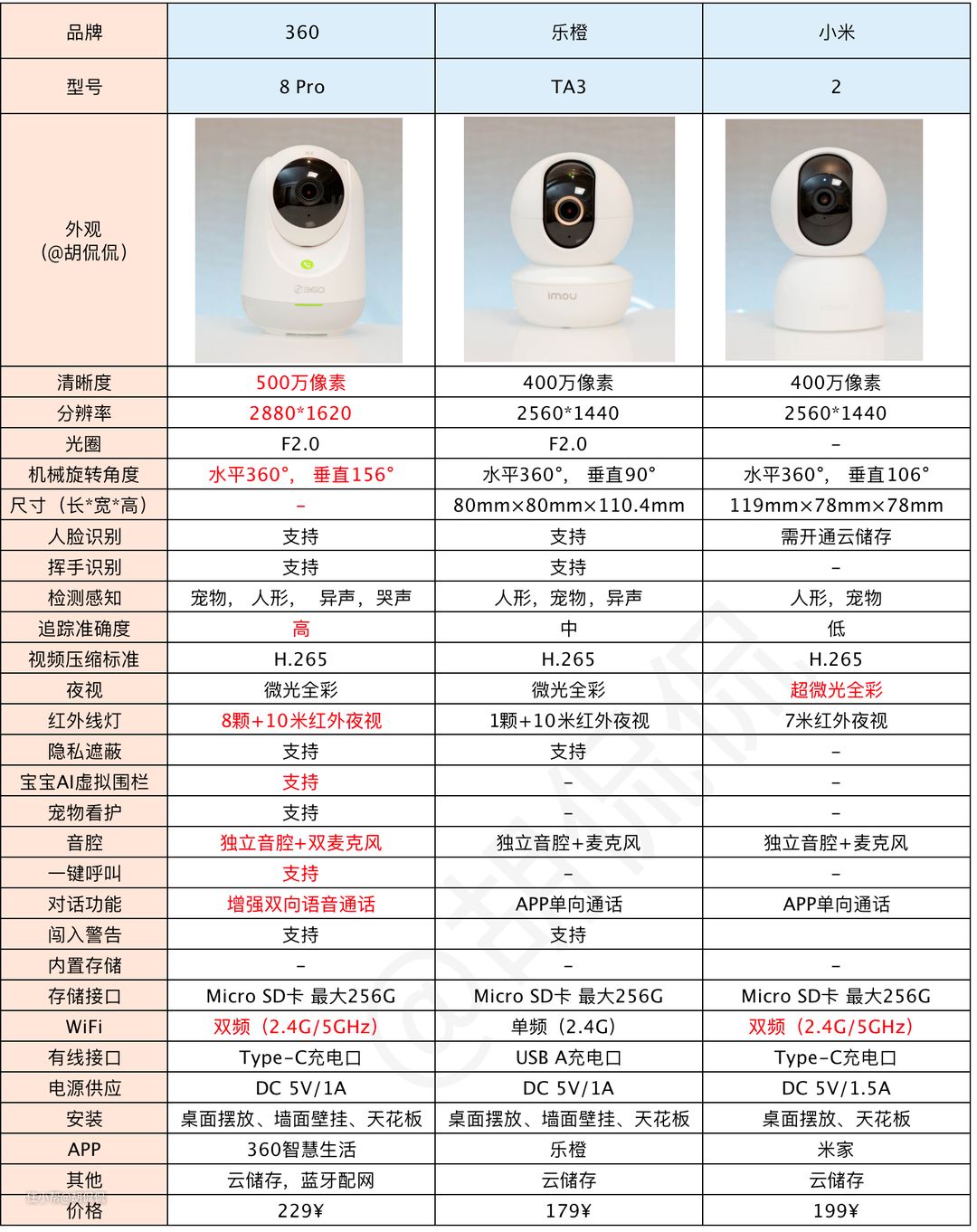 这三款机器的素质是360是500万像素BSI背照式传感器,3K分辨率画面是2880*1620。 乐橙和小米是400万像素, 2.5K画质是2560*1440。 和360相比有0.5K的像素差别, 在实际使用中成像会有差别,成像风格, 明暗度,具体我们后面看摄像机实拍。