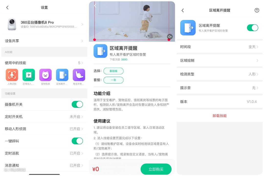 不得不提的是360独家的AI技能商店, 这个是360专门针对摄像机的技能应用商店系统。 比如可以有人物识别, 区域闯入提醒, 宠物检测, 区域离开提醒, 电话手势等, 目前这些功能全部免费。