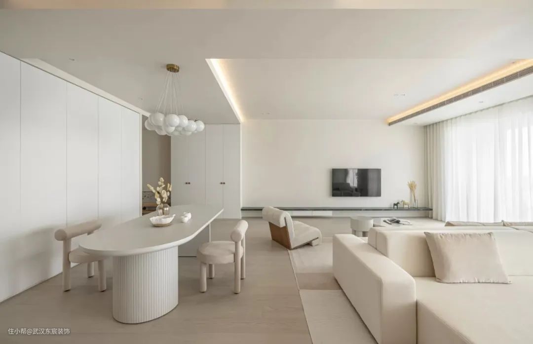 首先我们要知道,奶油风最直观也是最核心的特征在于,硬装空间简洁清爽,几乎没有冗余的设计,而软装却需要追求质感与细腻,软硬装相互协调,并保持色调的统一,才能打造出明亮温柔的居家氛围。