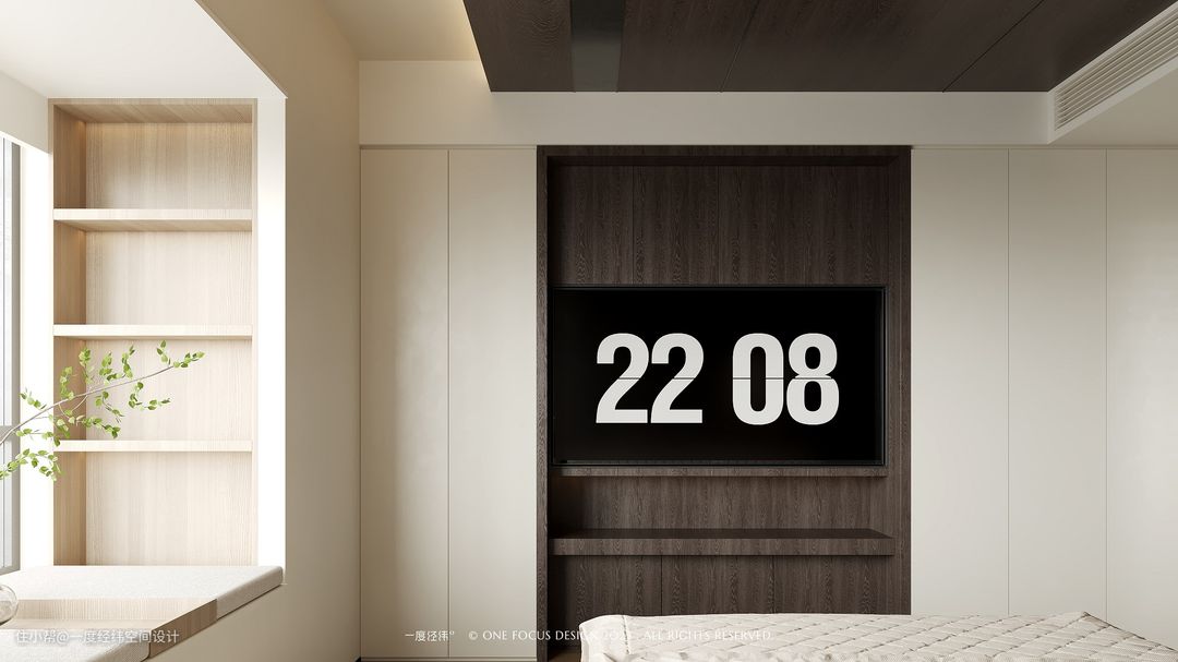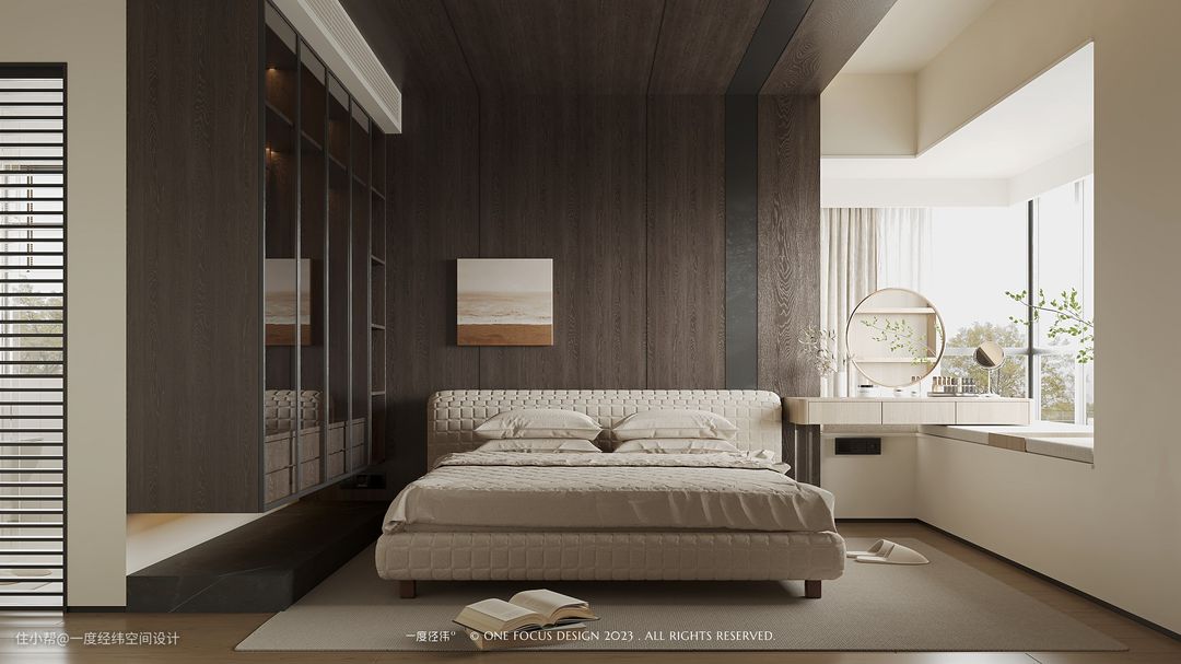 胡桃木墙板与触感舒适的白色肤感面板搭配设计,冷暖结合赋予了空间层次的变化,柔畅的线条交织出简而不凡的高端品质。