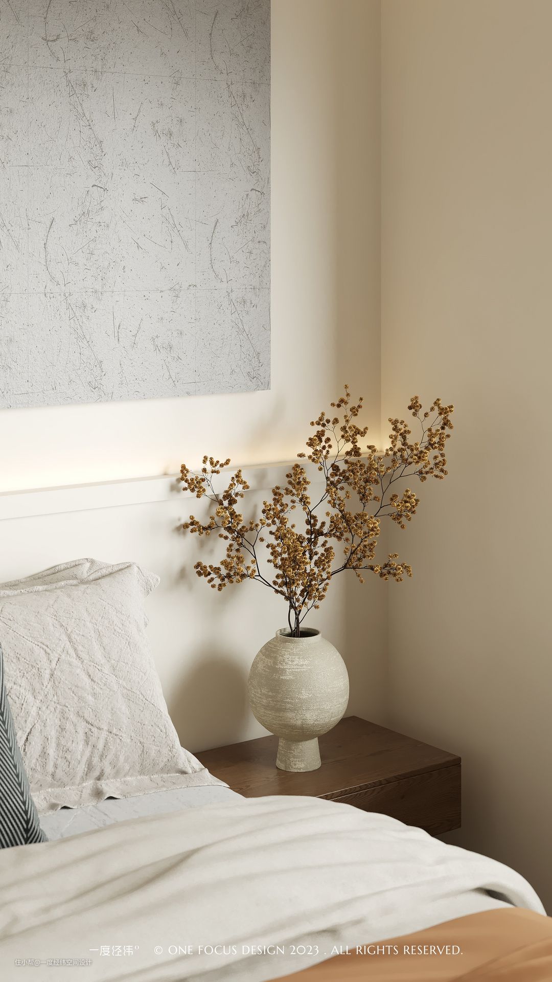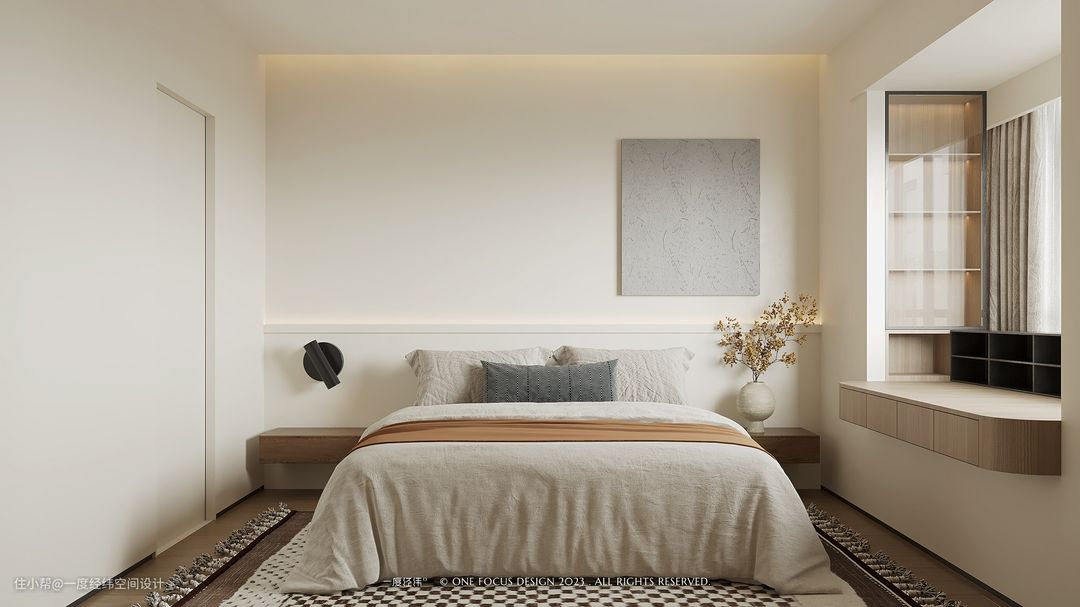 次卧的设计则用简单的纯色来表现空间的朴素与纯洁,大面积的纯白色与温润的木色展现空间的自然素雅。