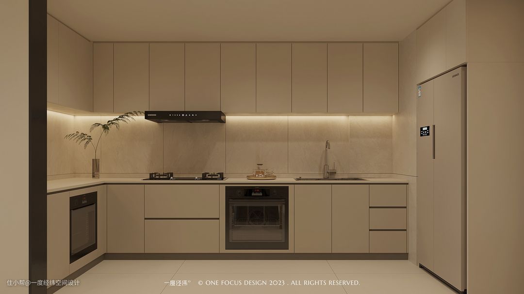 低调的现代简约厨房,温润细腻的米白色与U型的布局,完美拿捏拿-洗-切-炒的动线流畅。