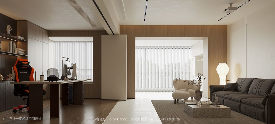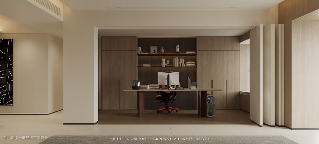 客厅与书房之间,设计师运用移动式折叠门来作为区域分割,形成联动,既有办公的私密性又营造了相当趣味的居家意境,平常由于不使用电视,折叠门也相当于投影的背景墙使用,空间划分更加灵活。