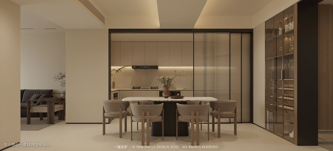 餐厅在色调和材质上延续了客厅的风格,岩板餐桌简洁高雅,搭配绒面餐椅,营造出自然舒适的用餐氛围。