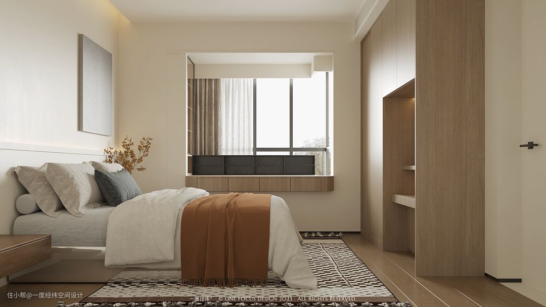 床头背景胡桃木护墙的大面积铺设,带来了简约有序的空间架构,有保证空间的整体感,温润的自然纹理与优雅的线条交织,营造出柔和温暖的休憩氛围。定制衣柜加入玻璃元素搭配灯带的照明设计,卧室氛围更加优雅通透。