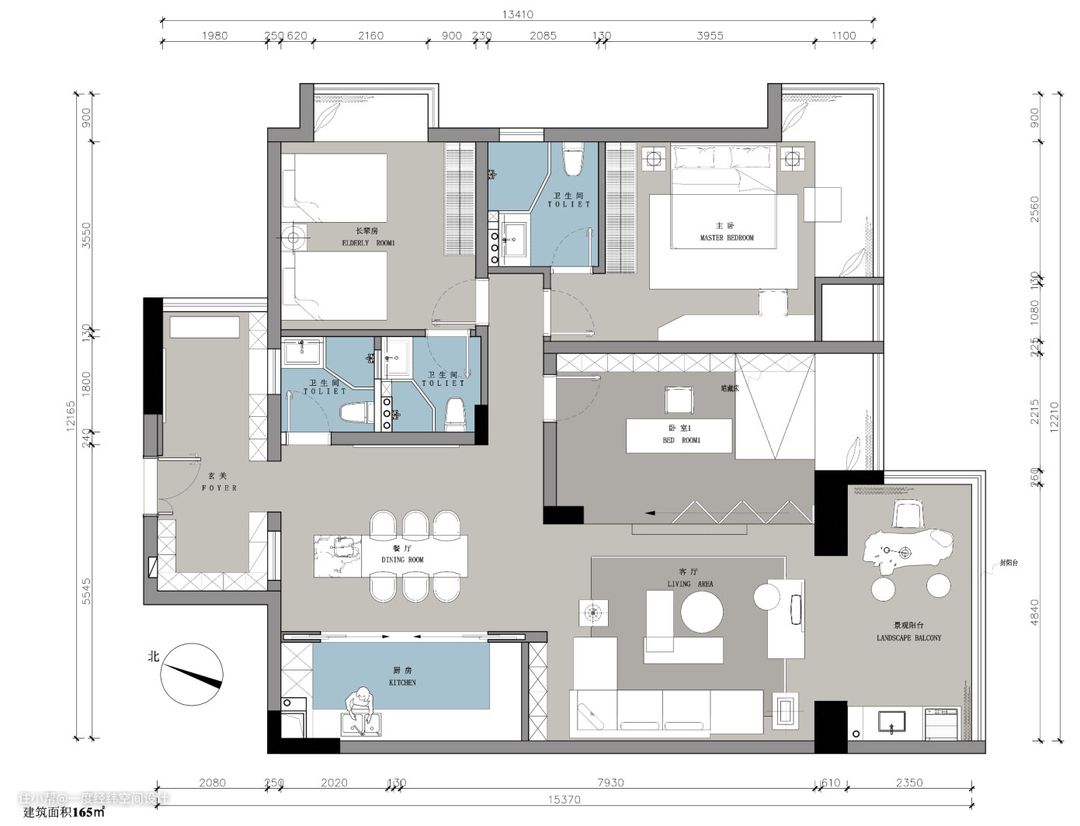 ③取消常规电视墙,打通多功能房与客厅墙面做开放式处理,增强空间体验感,同时折叠门的处理可以满足有客人使用时隐私性。