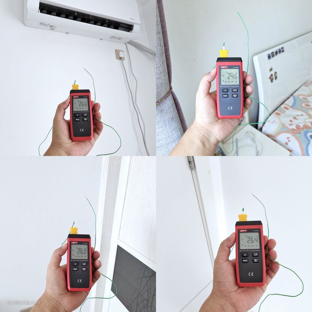 空调直吹方面的两个角落温度会低一些,分别是24.6℃、26℃。