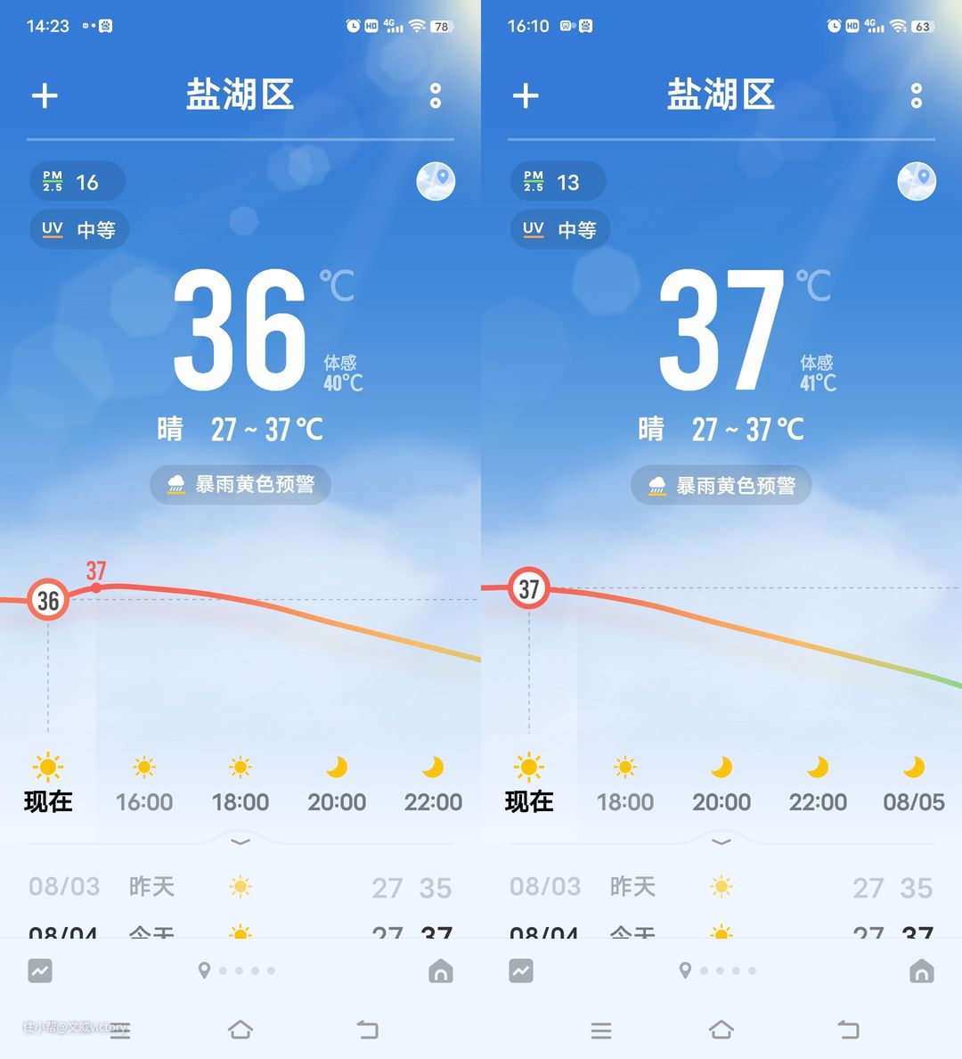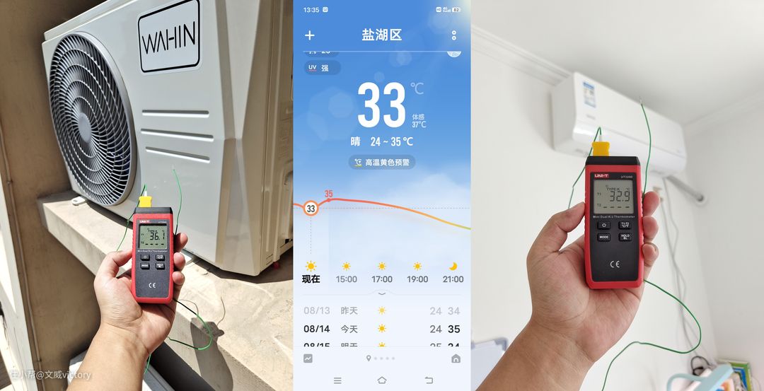 测试时间8月14日,气象预报最高气温35℃,实测外部气温36℃,室内温度32.9℃。