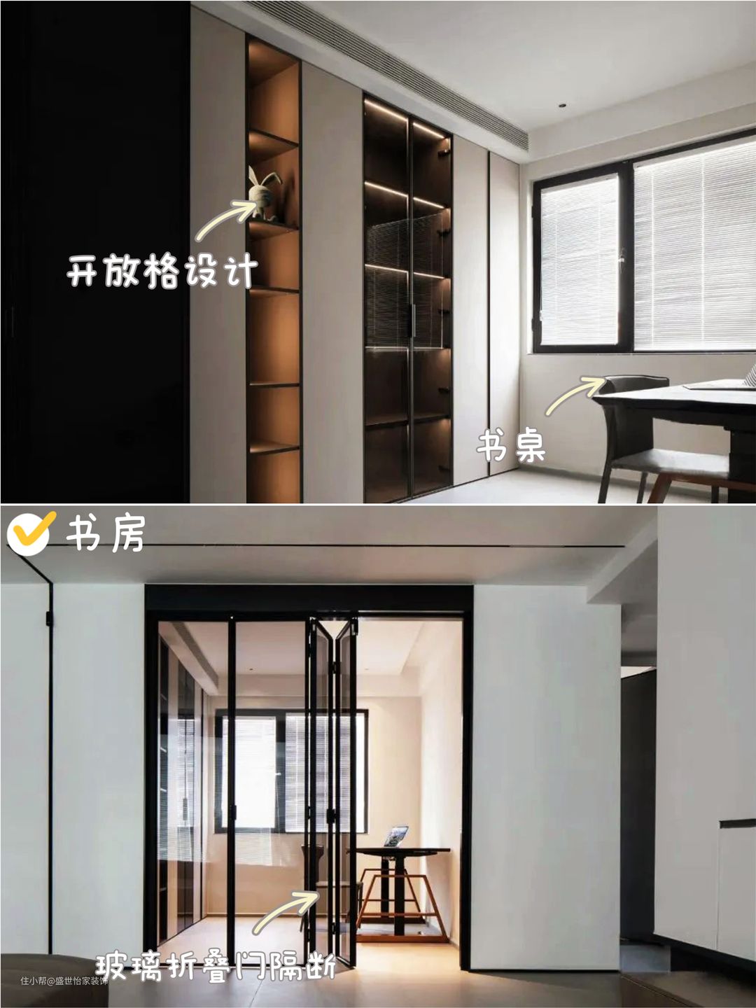 💚书房空间,采用玻璃折叠隔断门,玻璃的通透性保证了空间的开放性,搭配黑色玻璃的铁框,空间简洁却层次明显。