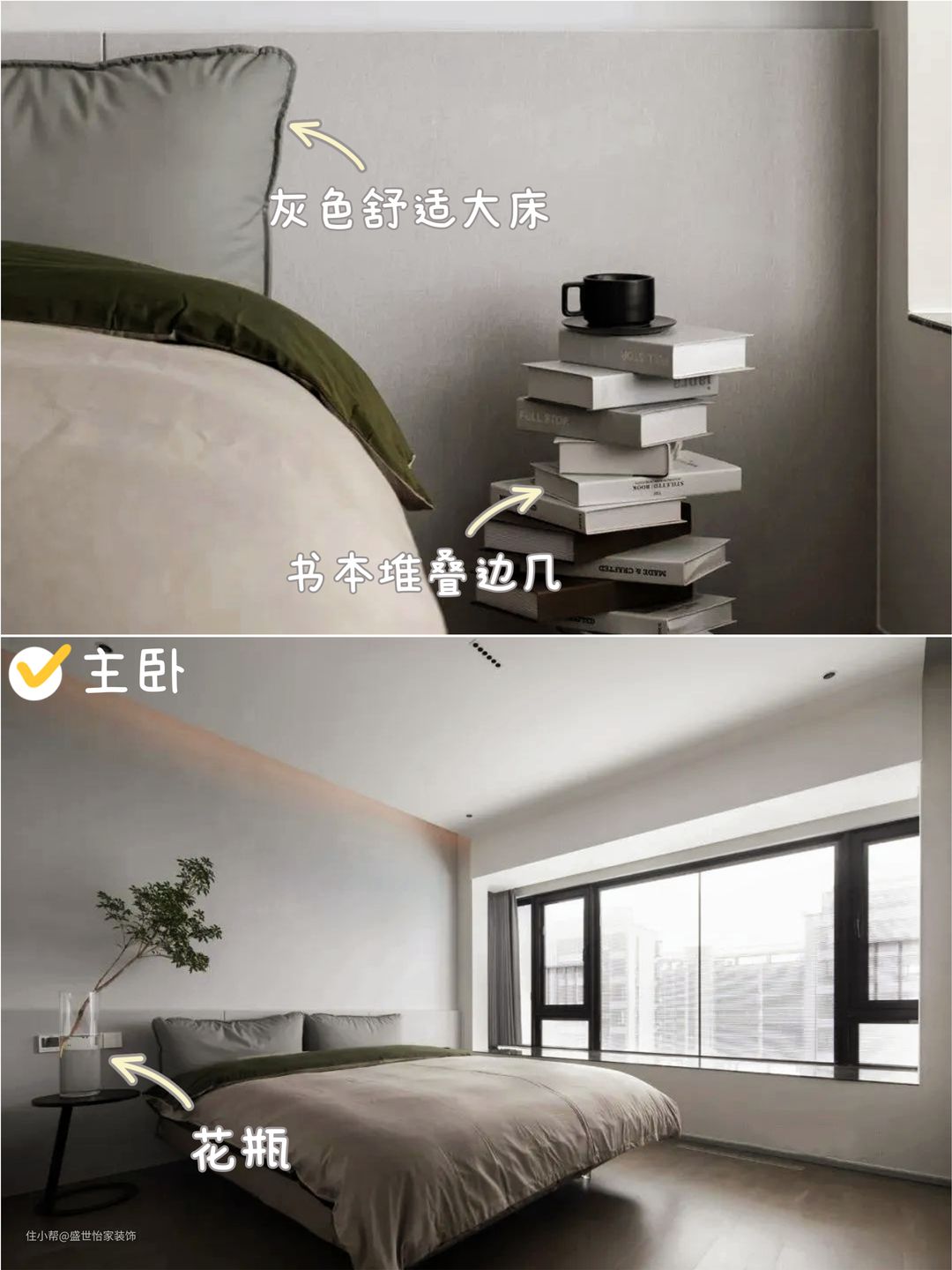 💚床头一角,通过不同层次的灰色底调进行墙面设计,增加空间层次感,搭配书本堆叠边几,凸显十足的文艺气息。