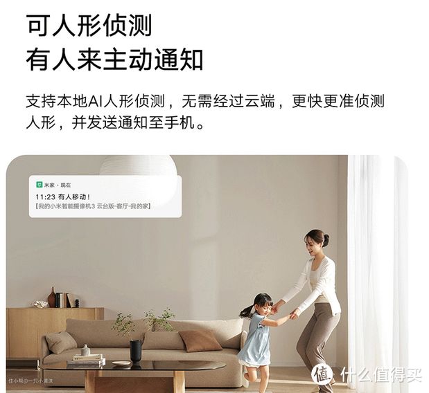 AI智能方面:支持本地人形检测、AI哭声检测、AI人脸识别功能。在人形侦测时,如果有人在移动,米家APP就会立马通知用户。
