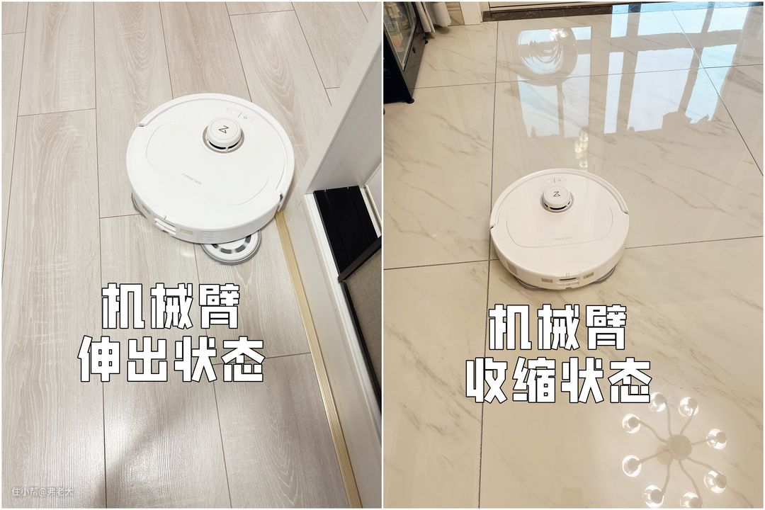 要说石头P10 Pro最让我耳目一新的设计,莫过于动态机械臂了。绝大多数机器人的拖布都是无伸缩拖布或固定机械臂,机动性较差,要么无法贴边清洁,沿边墙角是“弱项短板”,要么无法自动缩回,转弯避障时行动受限,可能磕碰座椅腿、沙发腿等家具,严重的甚至碰损家具。