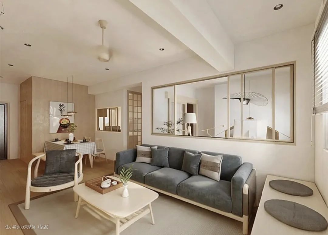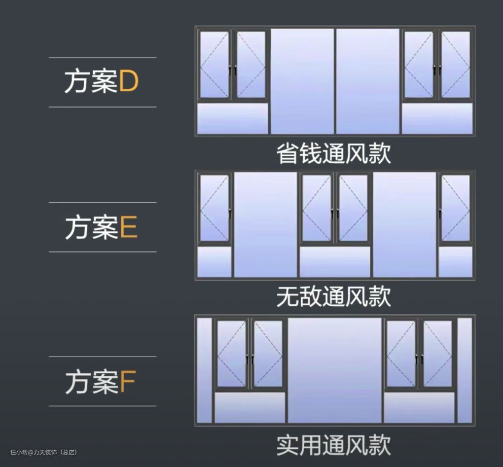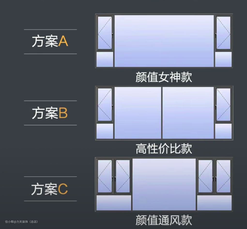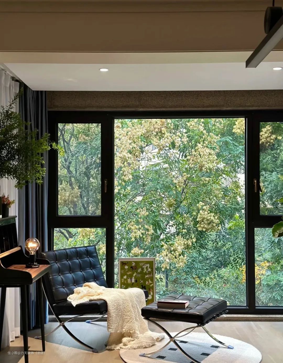 如果你不想放弃落地窗带来的风景,又想保留通风效果,也可以选择在中间位置保留大面积落地窗,在不额外加钱的情况下,玻璃尺寸越大越好;两侧位置搭配1-2扇半窗用于通风,实用和美观兼具,十分受欢迎。