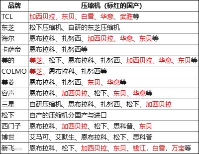 冰箱说到这里可能大家听上去不太给力呀,错了,咱们国人是最务实的,大家看一下这个表格,里边标注了各冰箱品牌使用压缩机的情况,真的,同一个品牌包括同一个型号的不同批次可能压缩机都不一样的。这也是为啥咱们国内的现在有合资的自研的没发力的原因。