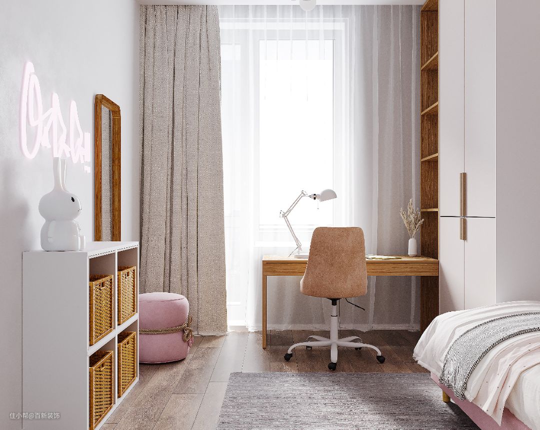 主题配色:房间以粉色、浅灰色和米白色作为整体配色方案。粉色代表着女孩的柔美和温暖,浅灰色和米白色则增添了一份优雅和清新的氛围。这样的配色方案能够为房间打造一个别致而舒适的视觉效果。
