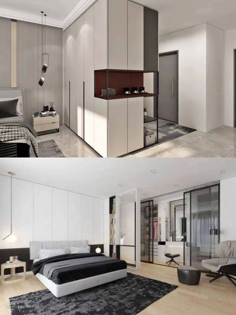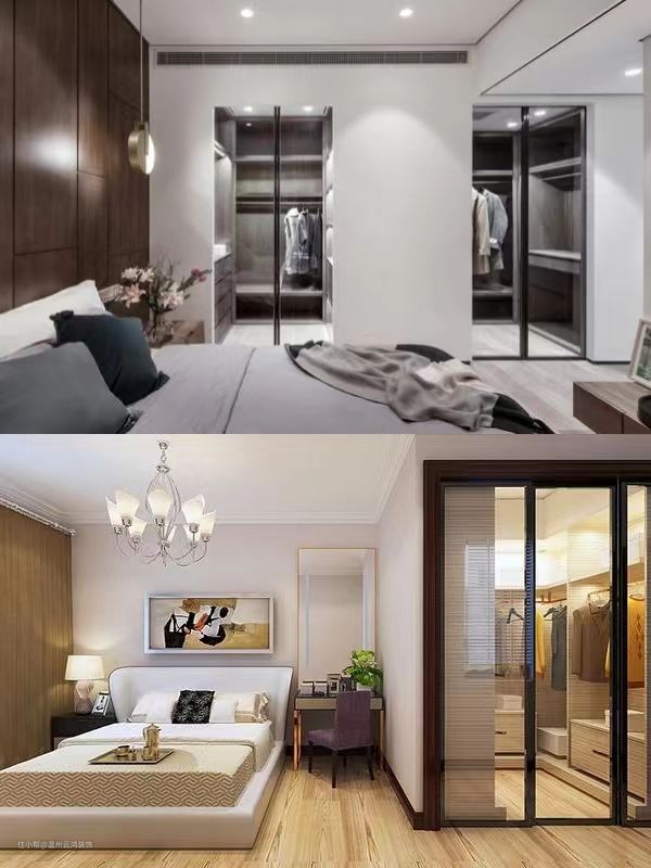 衣帽间是卧室的一个重要组成部分,可以设计在床的一侧,采用开放式或半开放式的布局,方便更换衣服和整理行李。衣帽间内部设计可以根据个人喜好和收纳习惯进行定制,可以设置多层衣架或抽屉,以便存放不同类型的衣物和鞋子。如果空间允许,还可以在衣帽间中加入梳妆台或全身镜,方便整理妆容和搭配衣服。