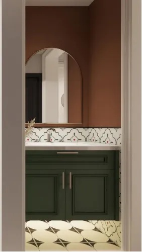 卫生间采用充满复古风情的小花砖和圆弧形镜子,配合绿色的悬空浴室柜,营造出一个舒适且具有个性的空间。这种设计既展现了法式复古风格的特点,又注重了实用性和美观性的结合。