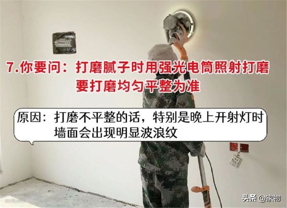 上面我们说过了找平的部分,但实际上,真正决定墙面平不平的一步,往往是打磨工艺决定的,打磨的同时也要用强光手电筒随时观察,单靠肉眼真不行。