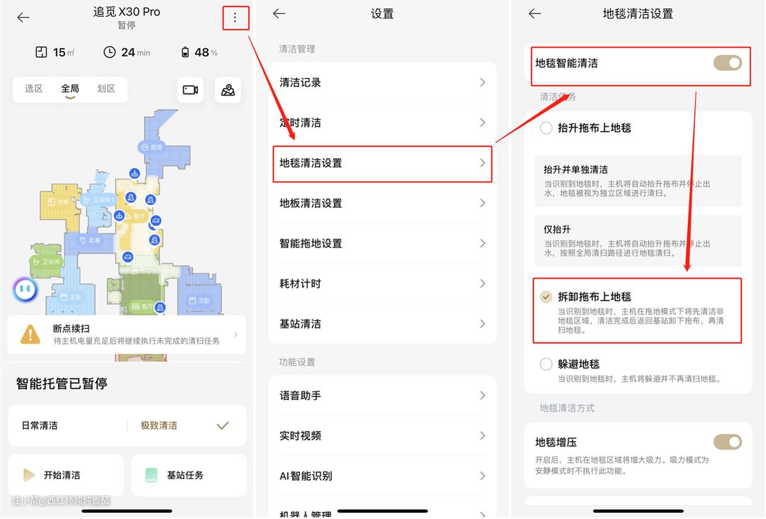 不过在收到机器之后还是需要简单设置一下:在「设置」-「地毯清洁设置」中,打开「地毯智能清洁」按钮,然后选择「拆卸拖布上地毯」 ▲