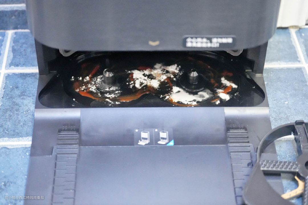 因为使用时间不长,所以我无法展示长期使用后的实拍图片。这里我用番茄酱(方便观察)+面粉(模拟泥沙颗粒)替代泥垢,然后将扫地机放回,执行一次拖布自清洁程序,观察清洁效果。