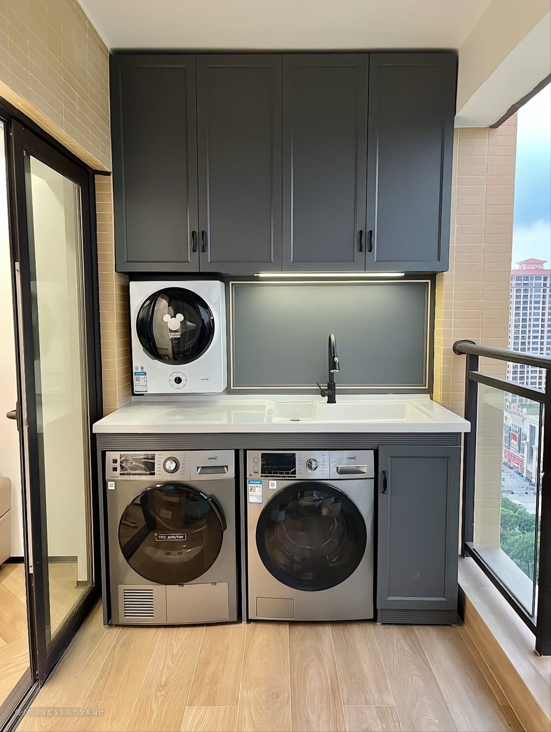 把阳台打造成洗衣房,收纳空间要规划好,日常使用起来才会方便又好看。由于市面上不同品牌的洗衣机有不同尺寸,所以要根据你选购的洗衣机尺寸以及阳台大小来做定制设计。
