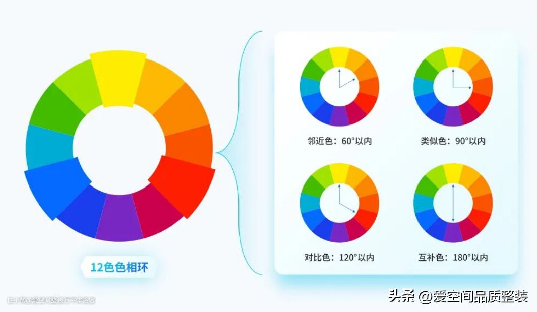 1、色相:色相环确立色彩搭配的规律,常见的色相环有12色和24色,都是基于红、黄、蓝三原色的,色相环选择方式的不同,就有了相近色、类似色、对比色、互补色等配色方式。