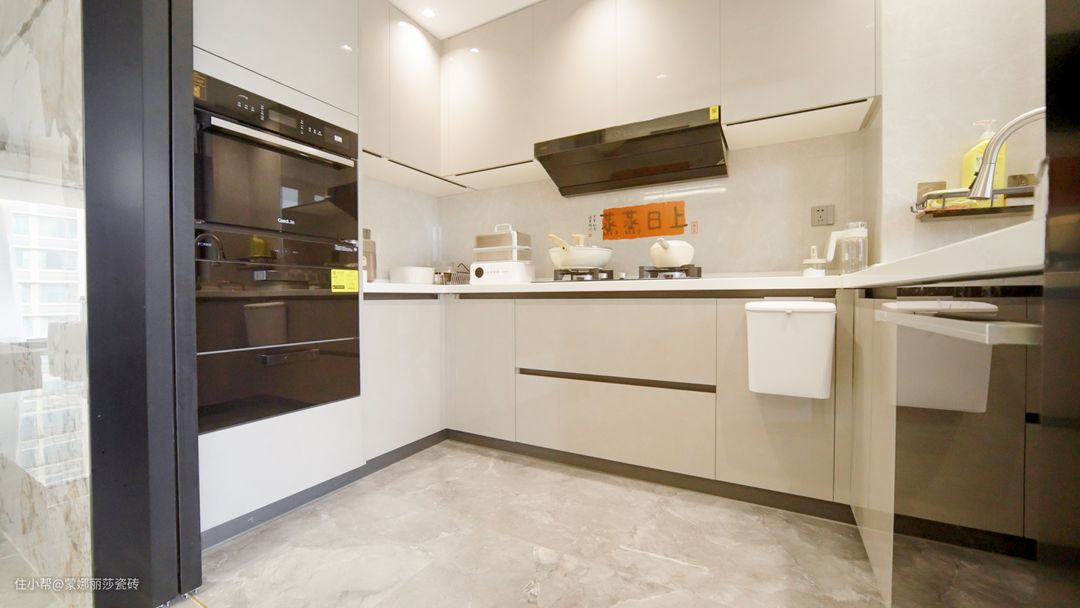 餐厅和厨房利用岛台设计进行划分,米色系餐厨柜与餐桌奠定素净的基调,与地面通铺的云梦灰大砖相互映衬,让开放式的用餐区域更加明亮开阔,用餐的氛围也更加温馨。厨房地面的亮面大砖中和了黑色的家电带来的冰冷感,又不会让米色橱柜过于温暖,起到了显著的调节作用。