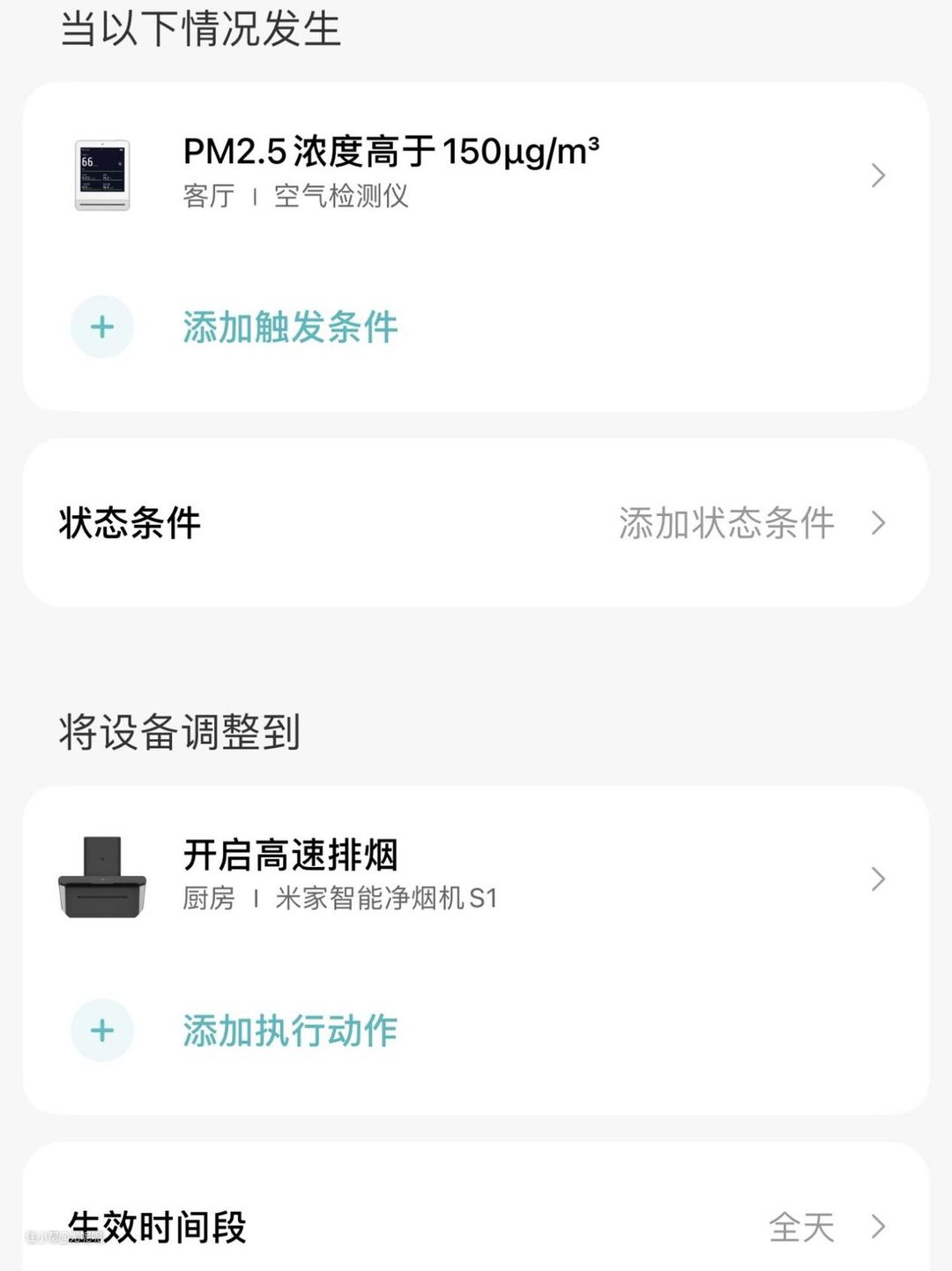 同时我还能通过传感器来增加联动设计,这样不论我们是否在做饭,只要我家餐厨空间的空气质量不好(PM2.5、湿度、燃气报警等等),烟机都可以自动开启进行净味。