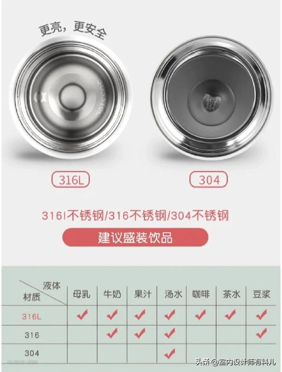 买保温杯不要只关注保温效果,更关注的应该是内胆材料,市面上常见的有201、304、316。