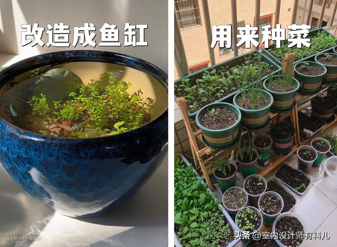 ②、多余的空花盆可以种菜,还可以当作垃圾桶,有创意的网友可以做成鱼缸,总之,在网上有很多DIY的小创意,你也可以试试看。