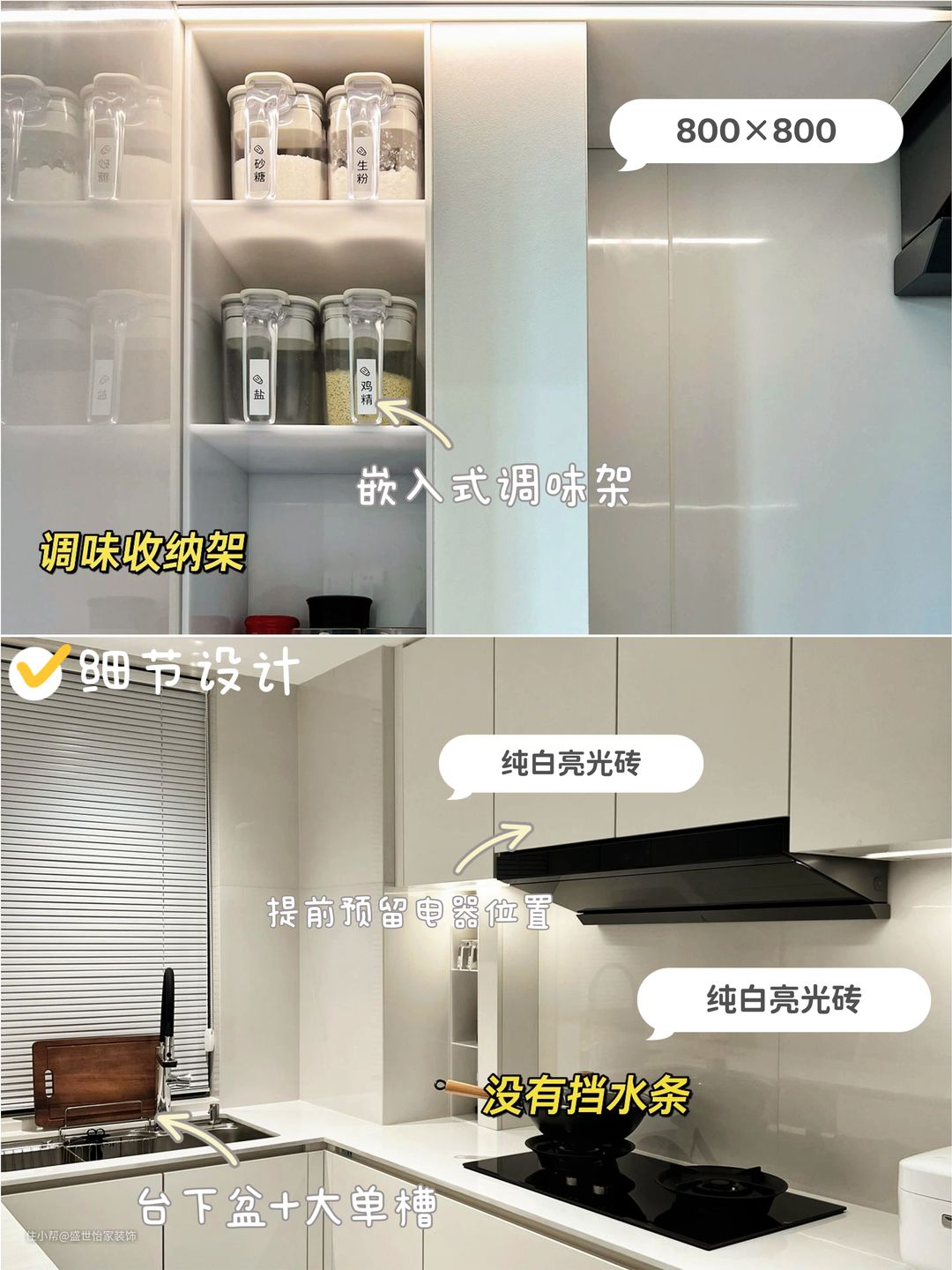 ❗省钱秘诀:吊柜地柜后面贴杂牌砖,中间贴800*800的纯白亮光砖,便宜、接缝少、好打理!