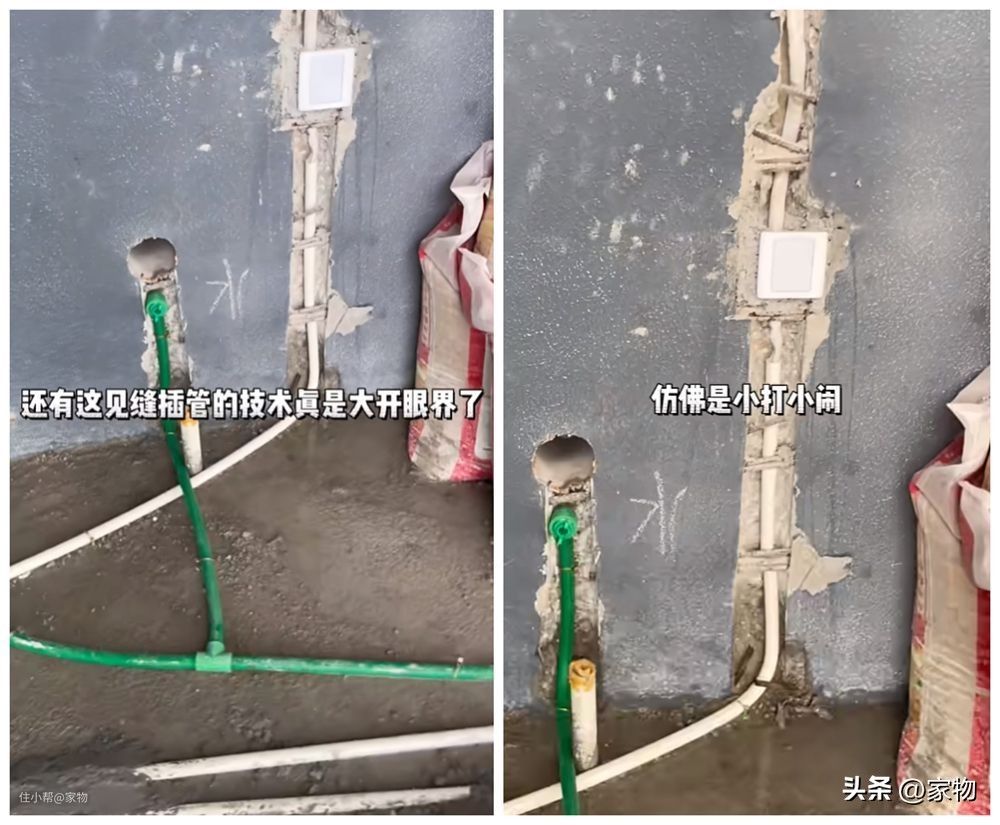 墙面上的开槽,也有把墙开裂的,这里反而不去补水泥,而是将线管歪歪扭扭地穿在了墙内,可以说,遇上这样的水电师傅,是真的倒了大霉。