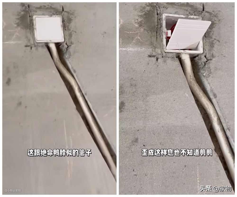 若说上面开孔开槽后面还能补救,那么接好的管线就要麻烦许多了,这位可怜的90后姑娘在家里找到了不止一处歪七扭八,一看就是受过挤压的线管,这种本应该截取掉的,但不知为什么师傅就这样直接给装上了。