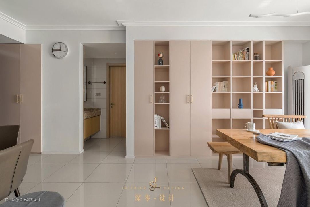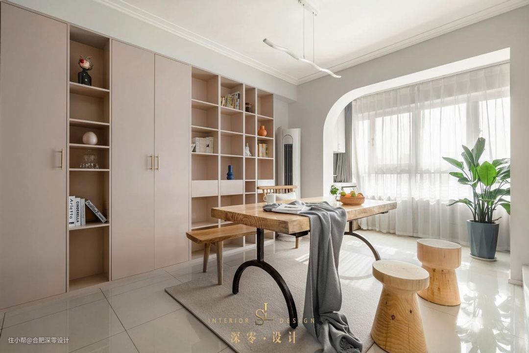 这是典型的去客厅化装修,舍弃原有的电视墙,茶几和沙发,用大型餐桌椅满足日常的会客+阅读+休闲+办公,妥妥的一地多用,非常适合中小户型。