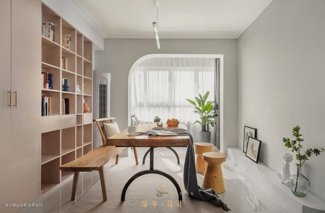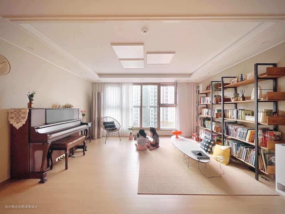 临近墙面大面积设收纳柜增容,局部留空设书架,拿取便利,还能放下不少的摆件或书架,以身作则在家阅读,比你对孩子说一百遍一千遍好好读书都强。