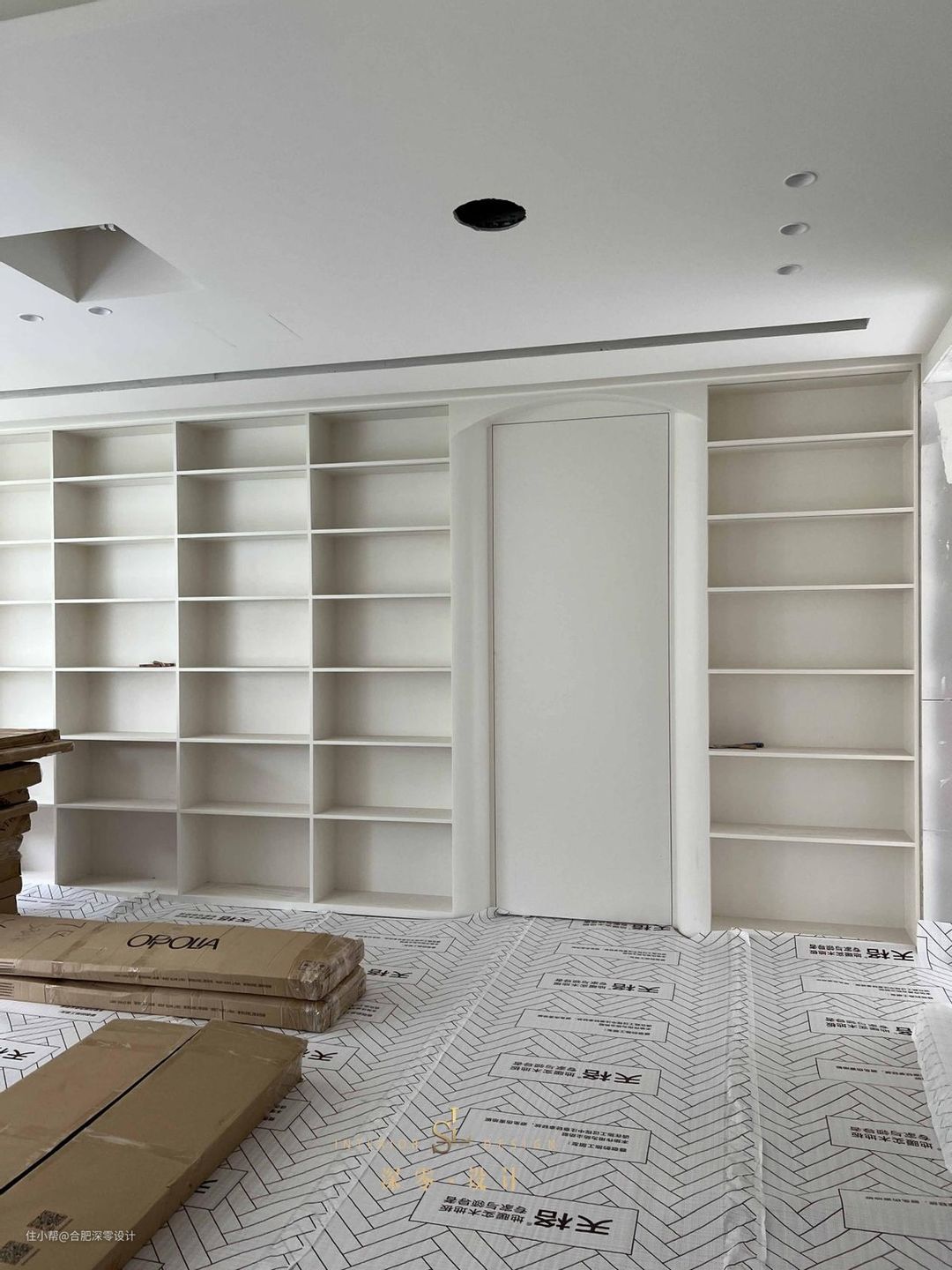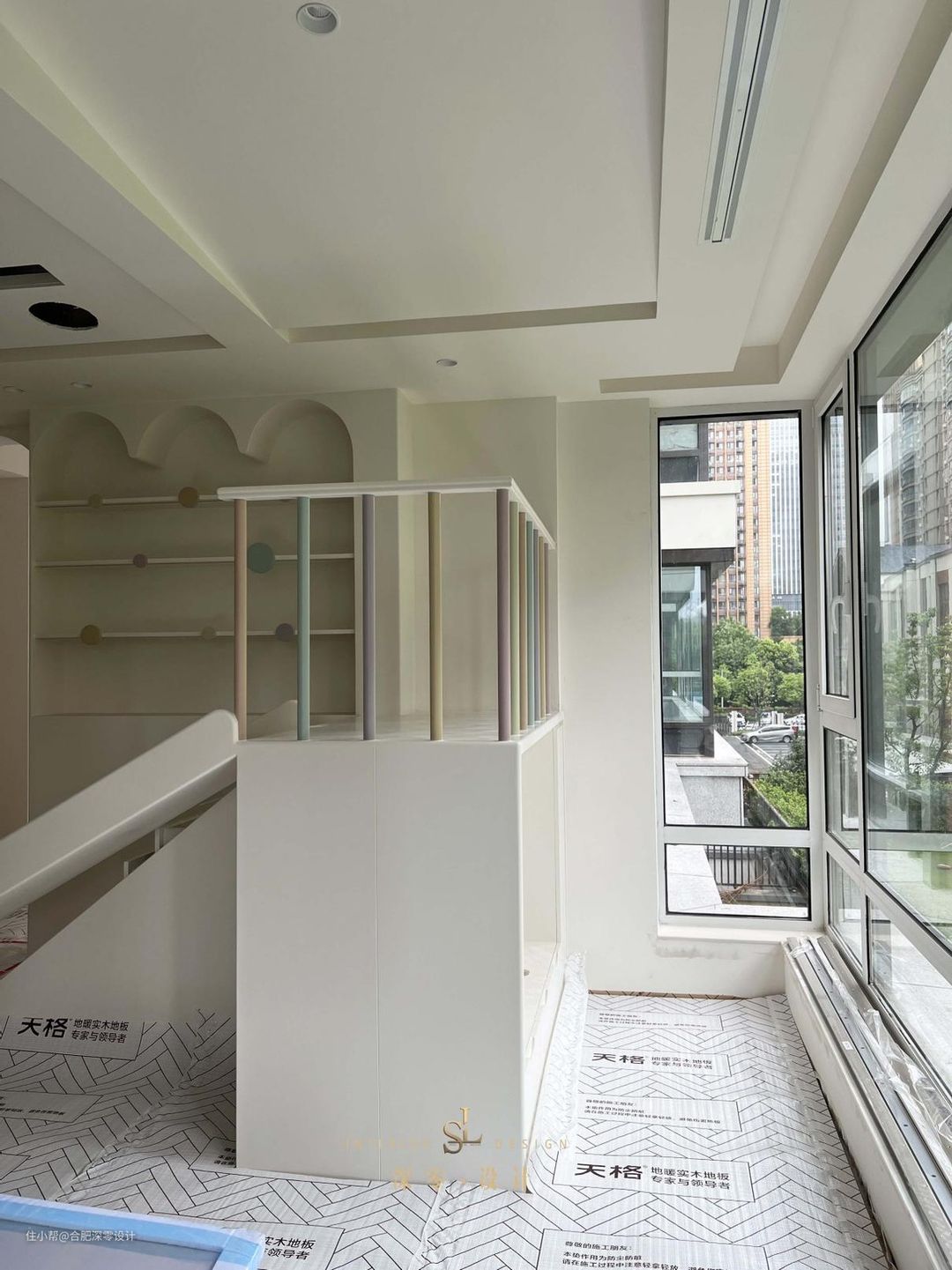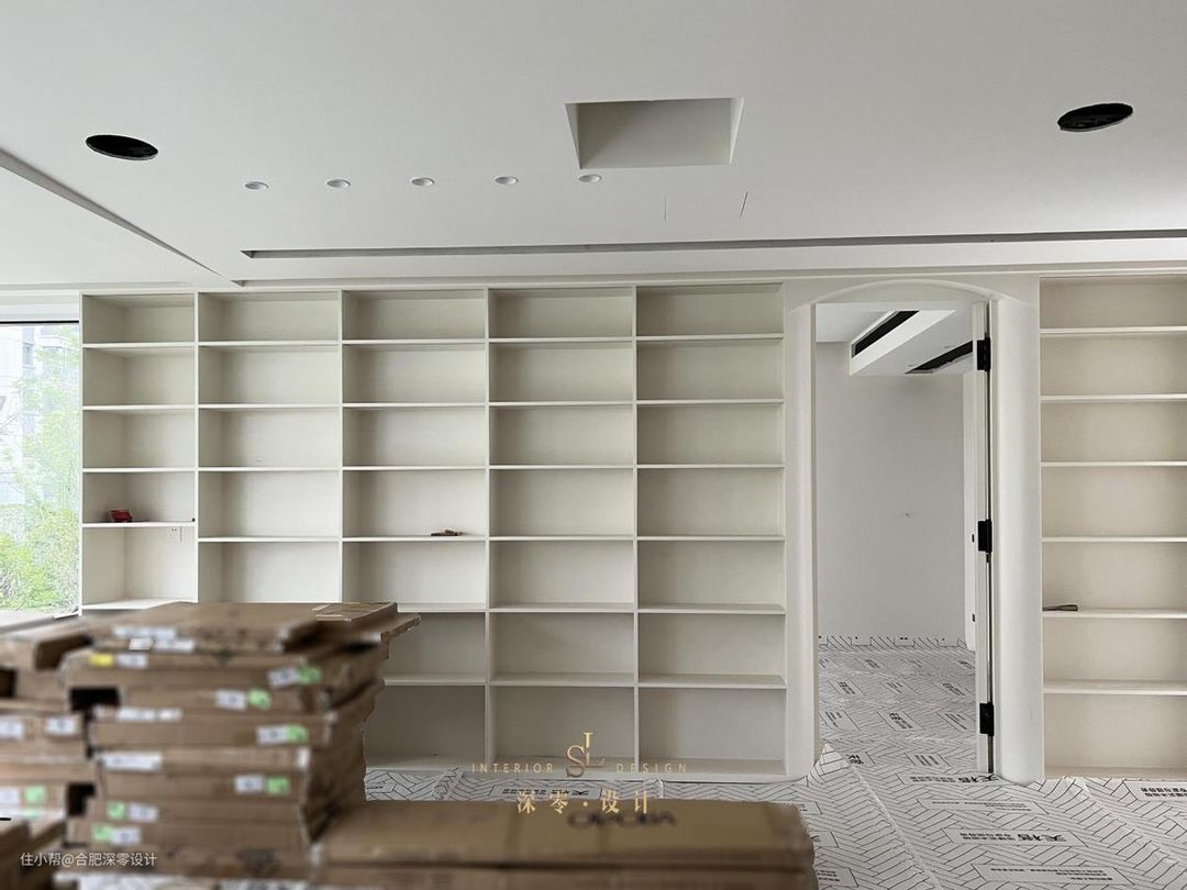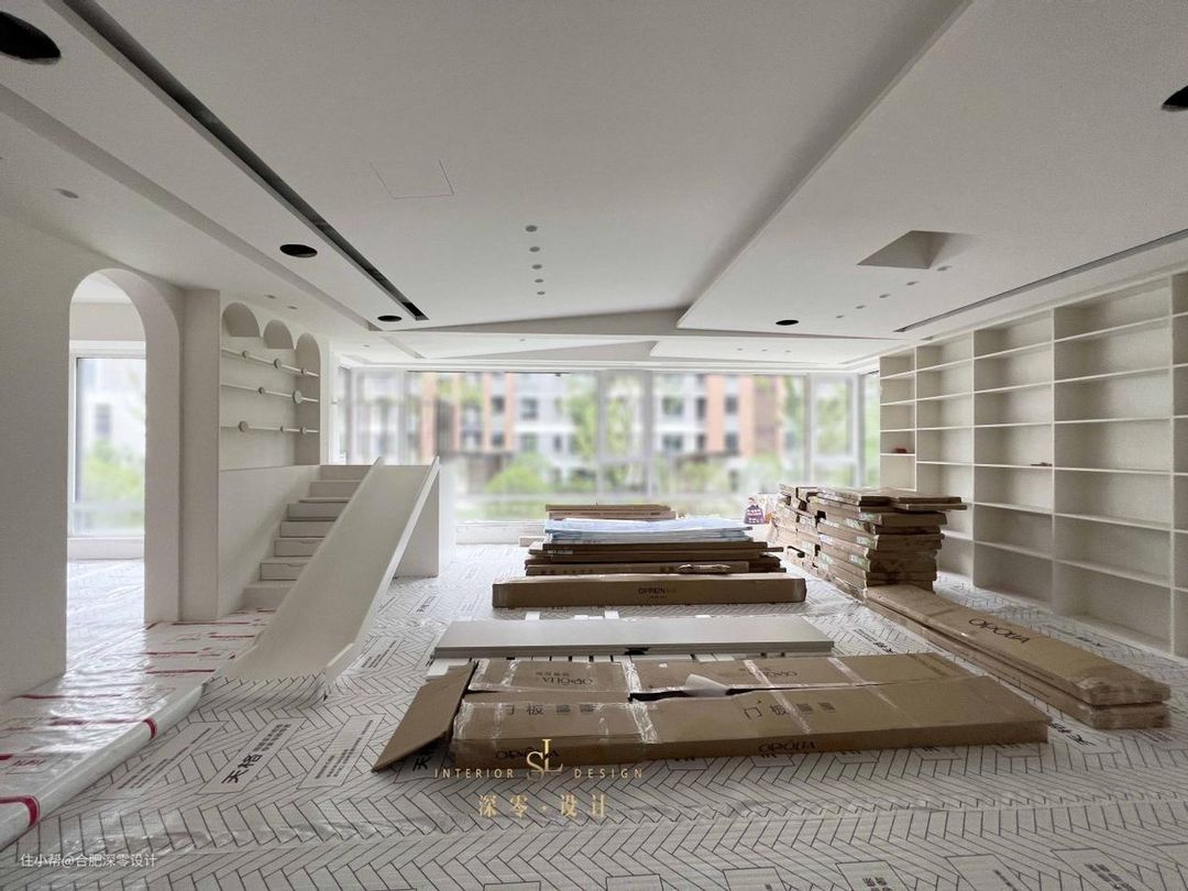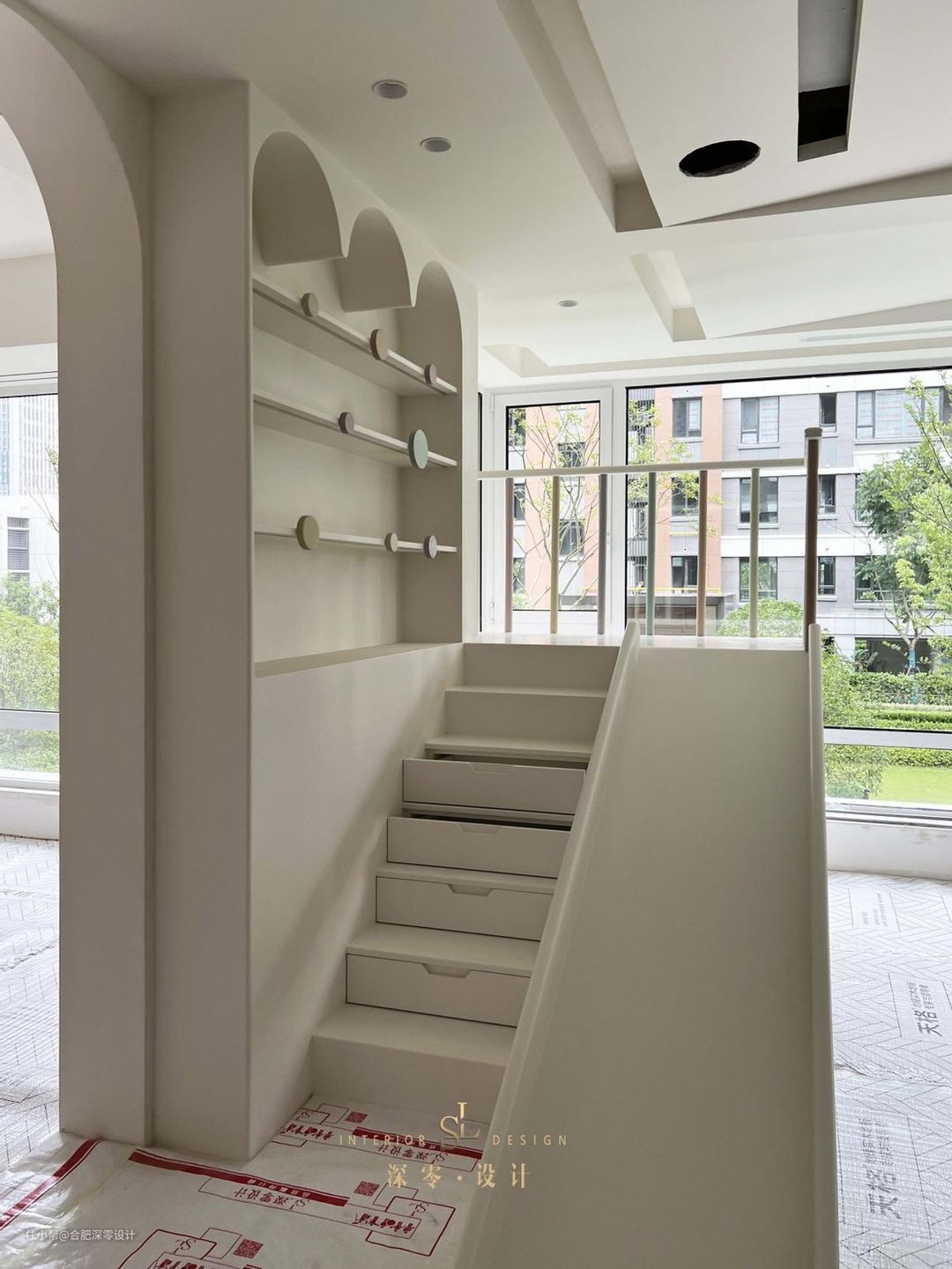 目前漆工刚刚结束,比起大部分客厅的常规装修,他家反倒更懂得取舍,不为客人,只为自己,客厅一侧现场打滑滑梯,踏步连通其上是局部留空的书架区,顶面还做了拱形处理。