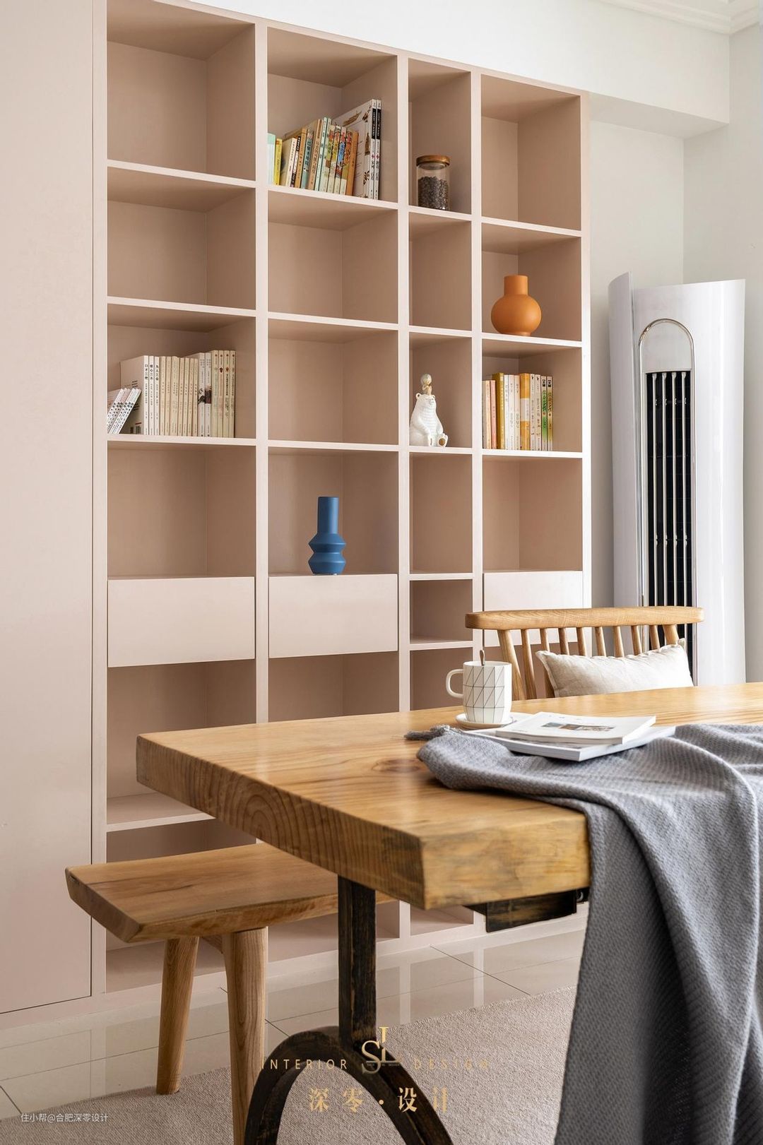 另外一面墙大面积设书架,很多人都担心开放式积灰落尘,其实这点不可避免,用手持清洁器定期清洁就好了,更何况,在未来的生活中和家人小孩一起,一点点填满书架,这种快乐也是不可替代的。