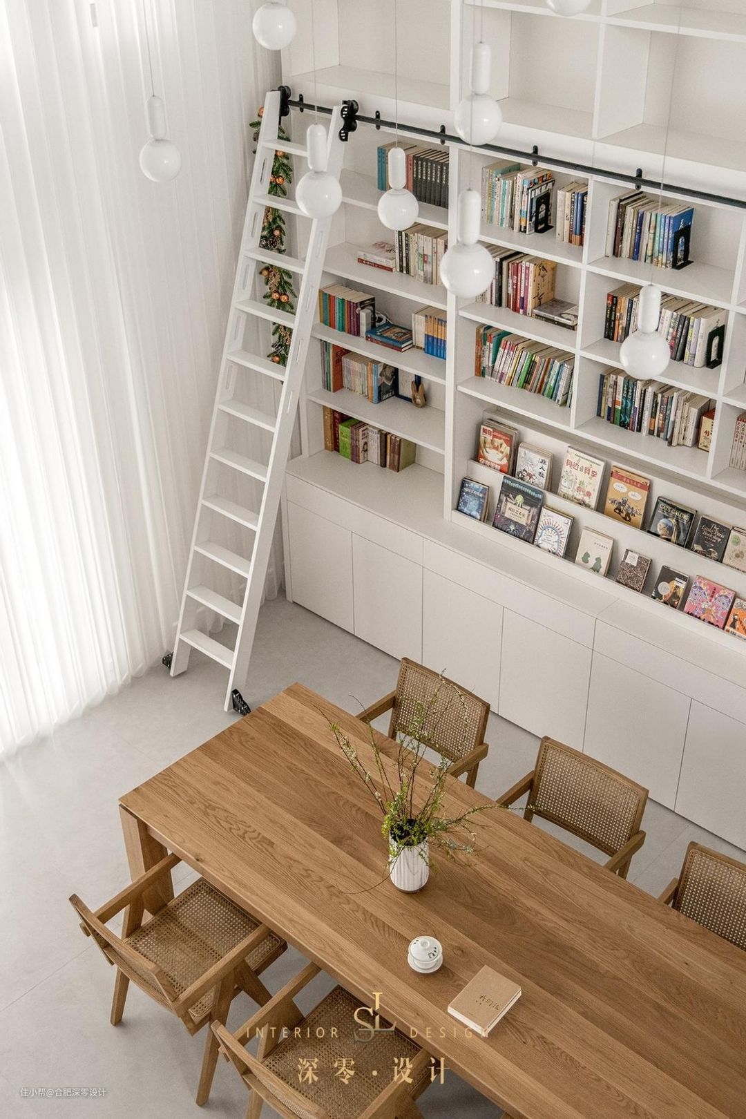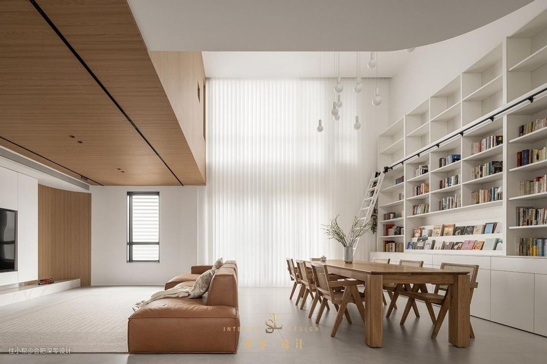 房子大的话,客厅里设书架相对就更为便利,并不一定非要用电视墙,可以考虑其他的闲置墙面,或者将书架和餐边柜适当结合,像这套房书架位于长餐桌一侧,让原本仅做用餐的区域,还能满足阅读+办公,拿放更加省心省力。