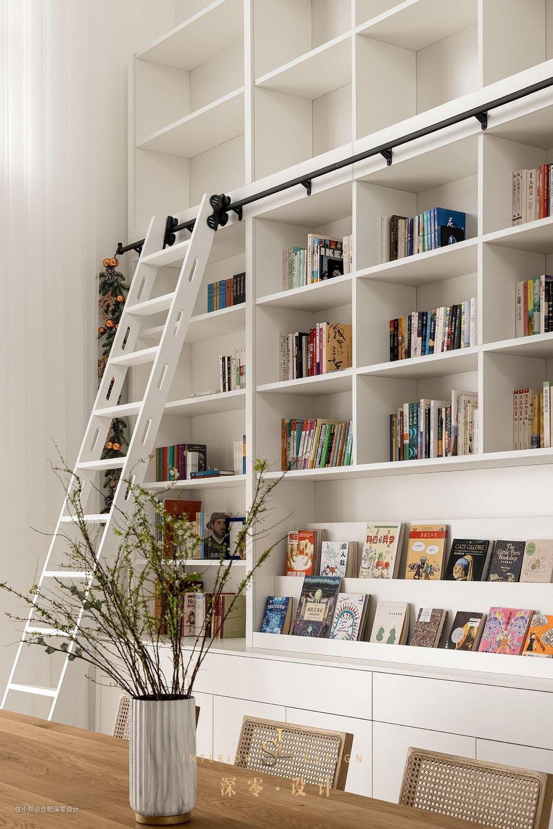 鉴于书架处于架空层,其上高度难免造成拿取不便,适当增加轨道+滑梯,后续不常用的书籍往上放就好,其下半高的矮柜可放些杂物,无把手柜门整洁清爽。