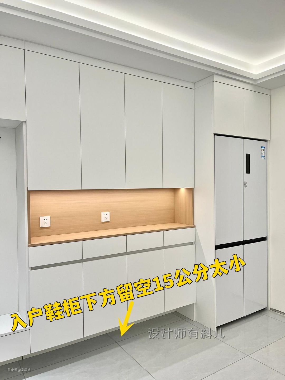 入户鞋柜是踩的第一个坑,本来做了功课,鞋柜下方是预留出来放鞋的,结果只留了15公分,高一点鞋帮的鞋子根本就放不进去。
