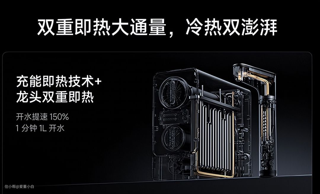 ▲▲虽然带加热功能的净水器早已不是新鲜事,但是,大流速即热的开水却是首次。从刚开始的热灌式加热到Q600/800这种龙头厚膜即热,使用双重即热的Q1000可谓是开创新时代的又一大创新。