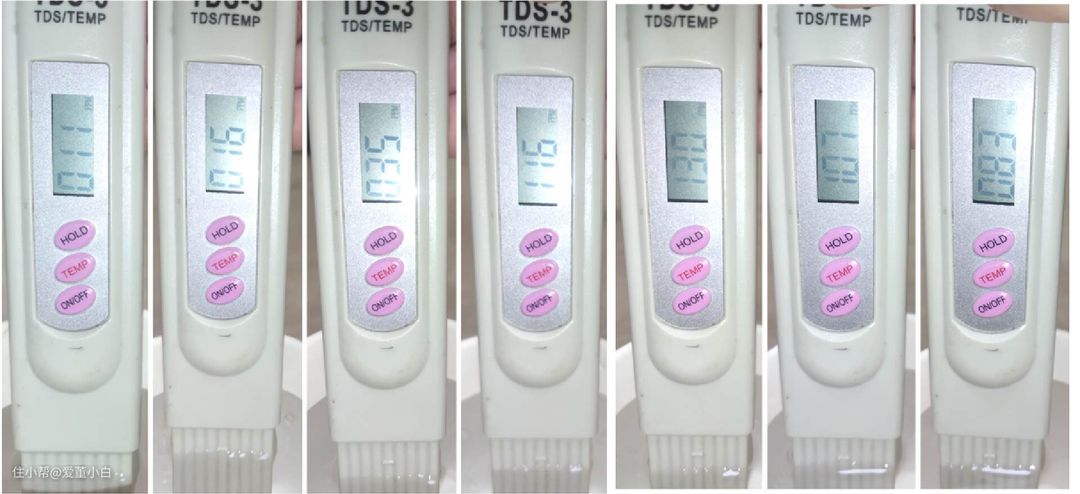 ▲▲通过上图可以看到,前七杯水TDS逐渐上升,最高点是130TDS,随后下降,一个很正常的曲线。第一杯低一些是因为RO膜壳到龙头出水口之间的水管内存有部分纯水的原因。
