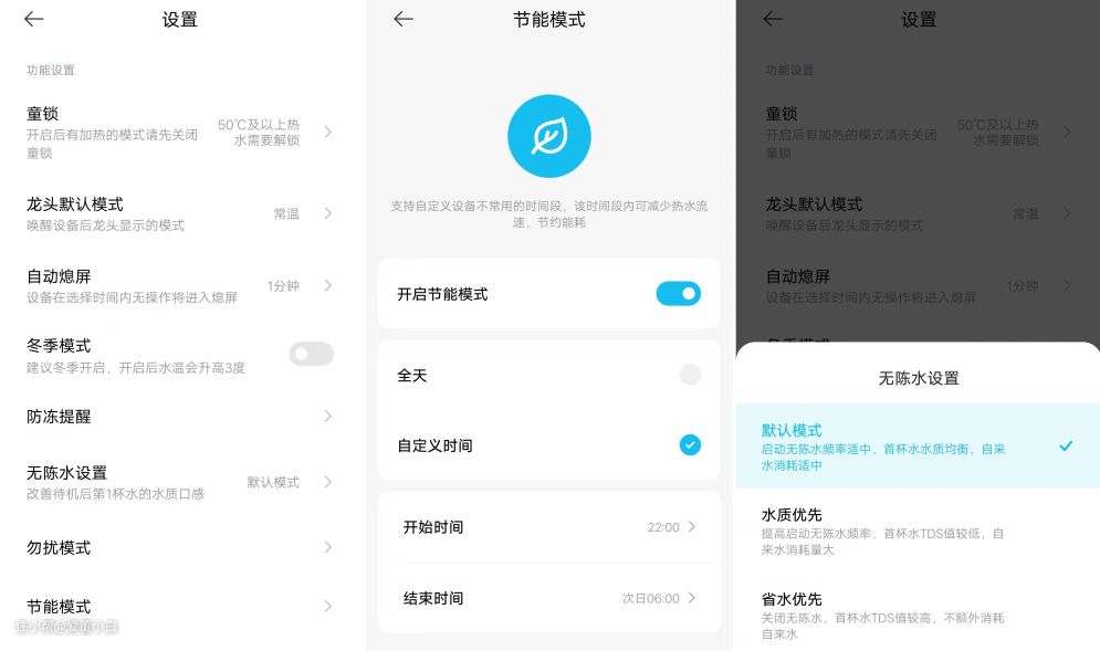 ▲▲设置里功能也比较丰富,如果家里没有儿童的话可以关闭童锁功能,取热水更快捷。节能模式可以自定义时间段,根据自己的生活情况设置来达到省电和热水流速的双平衡。而无陈水设置也可以根据需要选择默认或者水质优先。