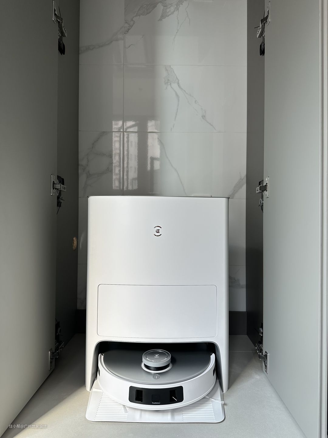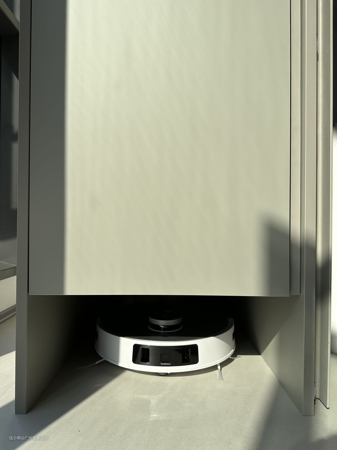 此外,如果有条件,卫生间可以采用悬空浴室柜和壁挂马桶,并且卫生间、厨房与公共空间的交界处过门石或者收边条高度不能高于2mm,否则会影响扫地机器人进出。